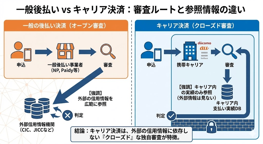 d払い、auかんたん決済、ソフトバンクまとめて支払いといったキャリア決済は、外部の信用情報機関(CICなど)を介さず、各キャリアとの「これまでの契約・支払い実績」に基づいて利用枠が決まります。つまり、過去にクレジットカードで事故を起こしていても、携帯代さえ払っていれば、実質的に審査なし(または極めて緩い審査)で後払いが可能なのです。